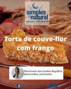 No Simples e Natural dessa semana, a Dra. Ana Carolina Magalhães, @anacarolina_nutricionista, nutricionista na Endocard Medicina Diagnóstica, ensina uma deliciosa receita de Torta de couve flor com frango. Confira os ingredientes: